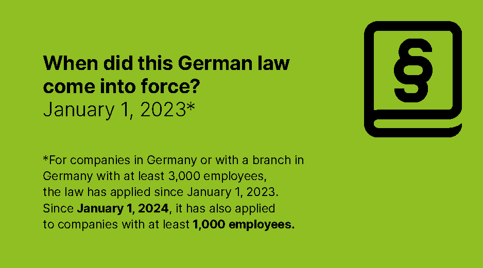 The law initially applied to companies with 3,000 or more employees, but since January 2024 it has also applied to companies with 1,000 or more employees with a registered office or branch office in Germany in accordance with section 13d German Commercial Code (HGB). The so-called “per capita principle” and the general employee definition of section 611a German Civil Code (BGB) apply to the number of employees. This does not differentiate between part-time and full-time employees.