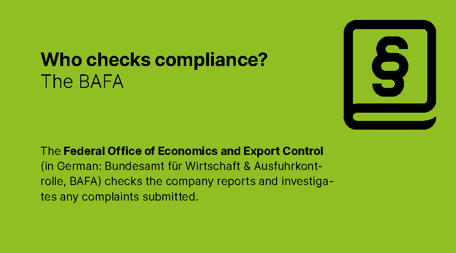 The Federal Office of Economics and Export Control (BAFA) checks the company reports and investigates complaints submitted. The specific tasks of the BAFA in relation to the Act on Corporate Due Diligence Obligations in Supply Chains include: