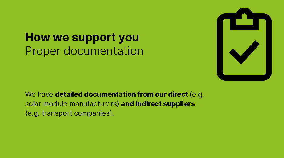 The due diligence obligations relate to the company’s own business area, the actions of a contractual partner and the actions of other (indirect) suppliers. The Federal Office of Economics and Export Control (BAFA) has issued FAQ on this subject. There is no specific reference to the photovoltaic industry. The following is defined as a supply chain: