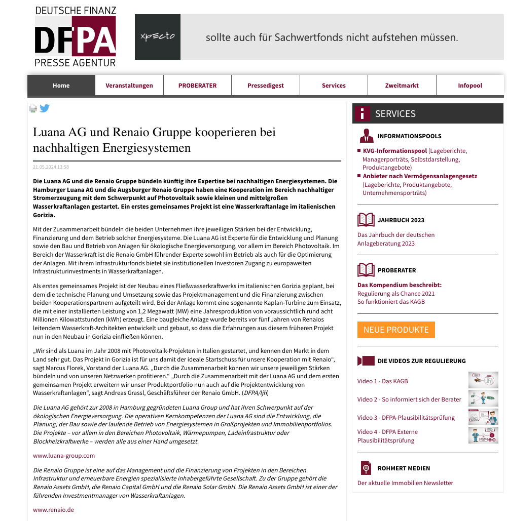 Bild: Screenshot des veröffentlichten Artikels „Grüner Strom: Luana AG und RENAIO Gruppe kooperieren bei nachhaltigen Energiesystemen“ in „DFPA Deutsche Finanz Presse Agentur“, 2024